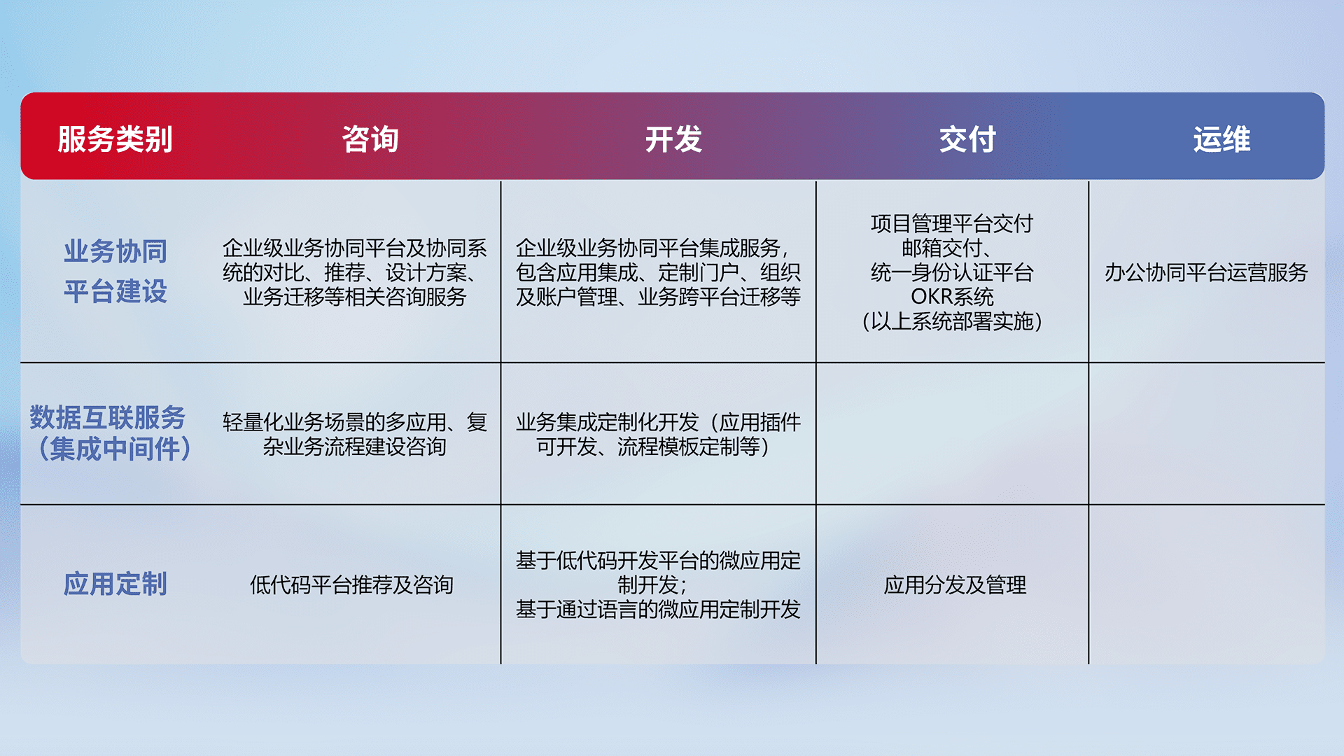 针对钉钉、、、、企微、、、、IDaas等平台级产品提供产品的规划、、方案、、交付、、、、定制化开发等服务,,,实现如统一协同办公、、、、智能客户服务、、、、混合会议管理、、智能数据查询、、、、等业务场景,,,,实现数字化转型。。