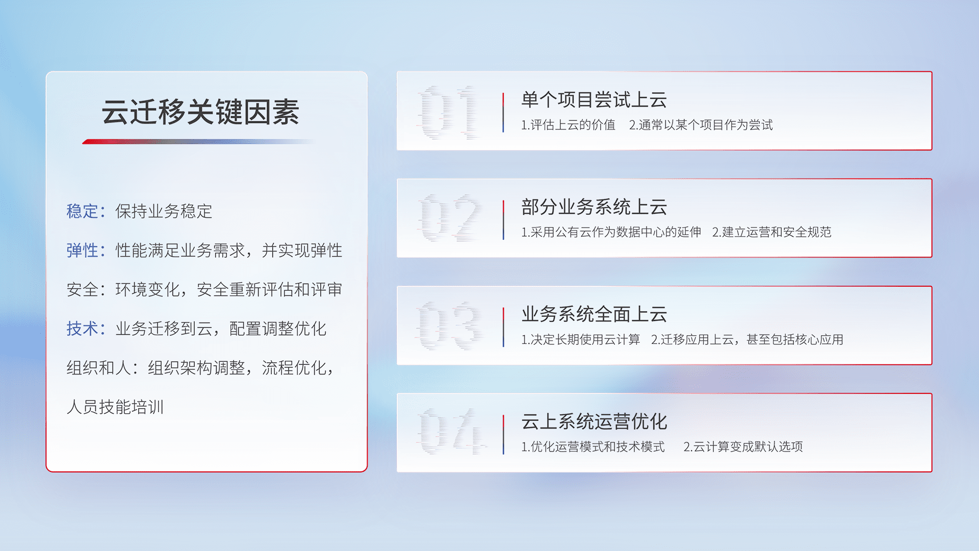 结合实际业务,,,从规划设计、、云平台选型、、、、云原生改造、、、数据迁移、、、、集成交付,,,迁移全过程为客户识别最佳上云路径,,做好风险识别管理,,,,设计网络架构、、、身份权限、、安全审计合规、、、、操作审计、、、日志审计、、监控告警策略、、多站点容灾设计等,,,对云上基础设施进行整体规划,,,,提升IT治理水平,,以满足弹性、、高可用、、、、高性能的需求。。。。