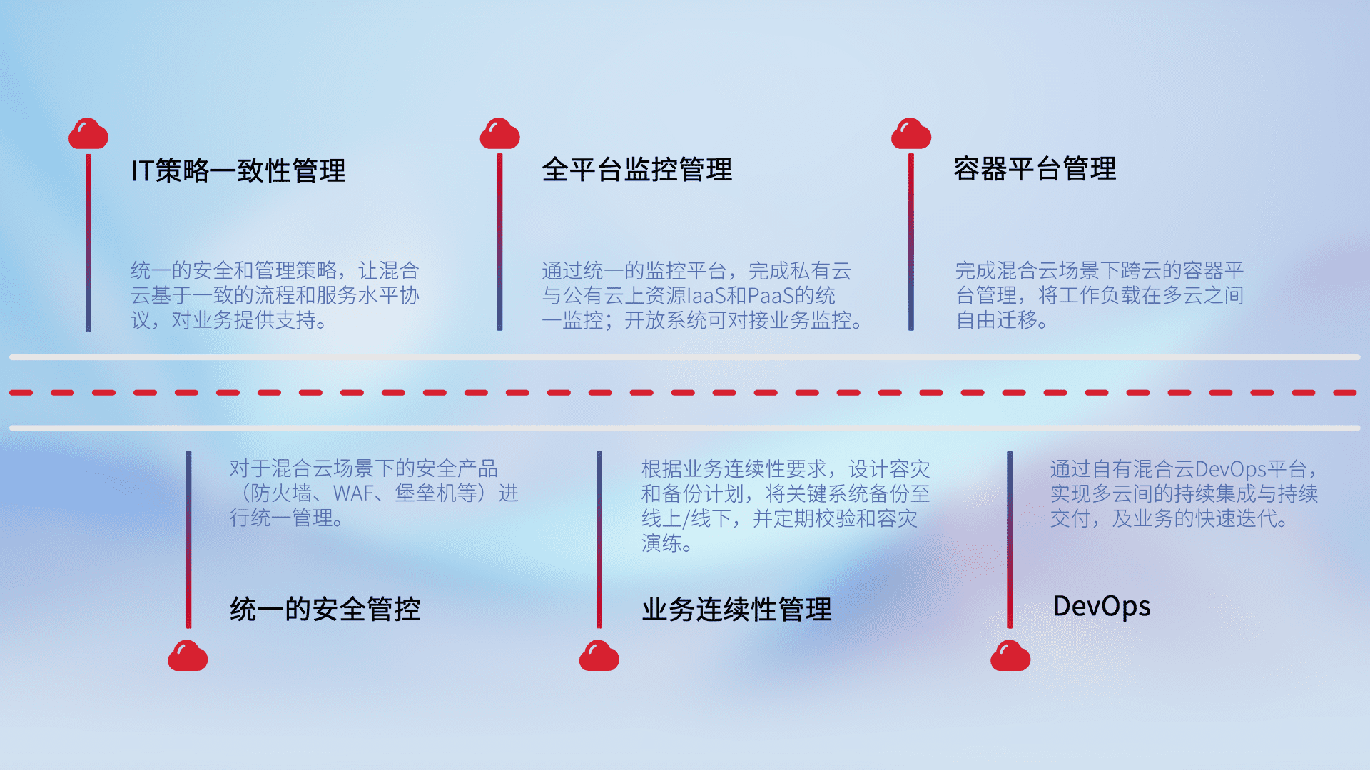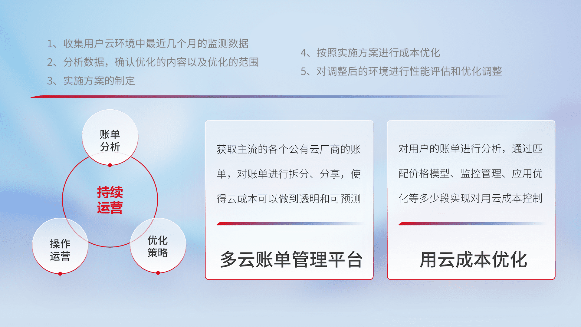 通过多云纳管,,,以统一的资源数据模型把客户的云资源进行抽象和封装,,,,进而实现对多云资源的统一操作,,保障云资源管理的可靠性、、、、稳定性与可用性。。量身定制化运维内容,,,,配置、、、、开发运维、、、补丁管理、、、备份、、监控、、、认证和访问管理、、审计和日常巡检等,,,,保障在用云过程中的可靠度,,稳定度以及高可用率。。。